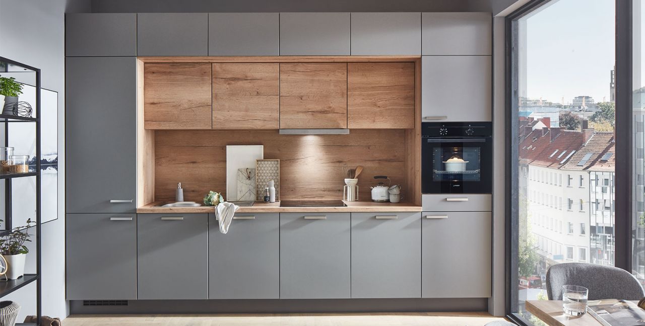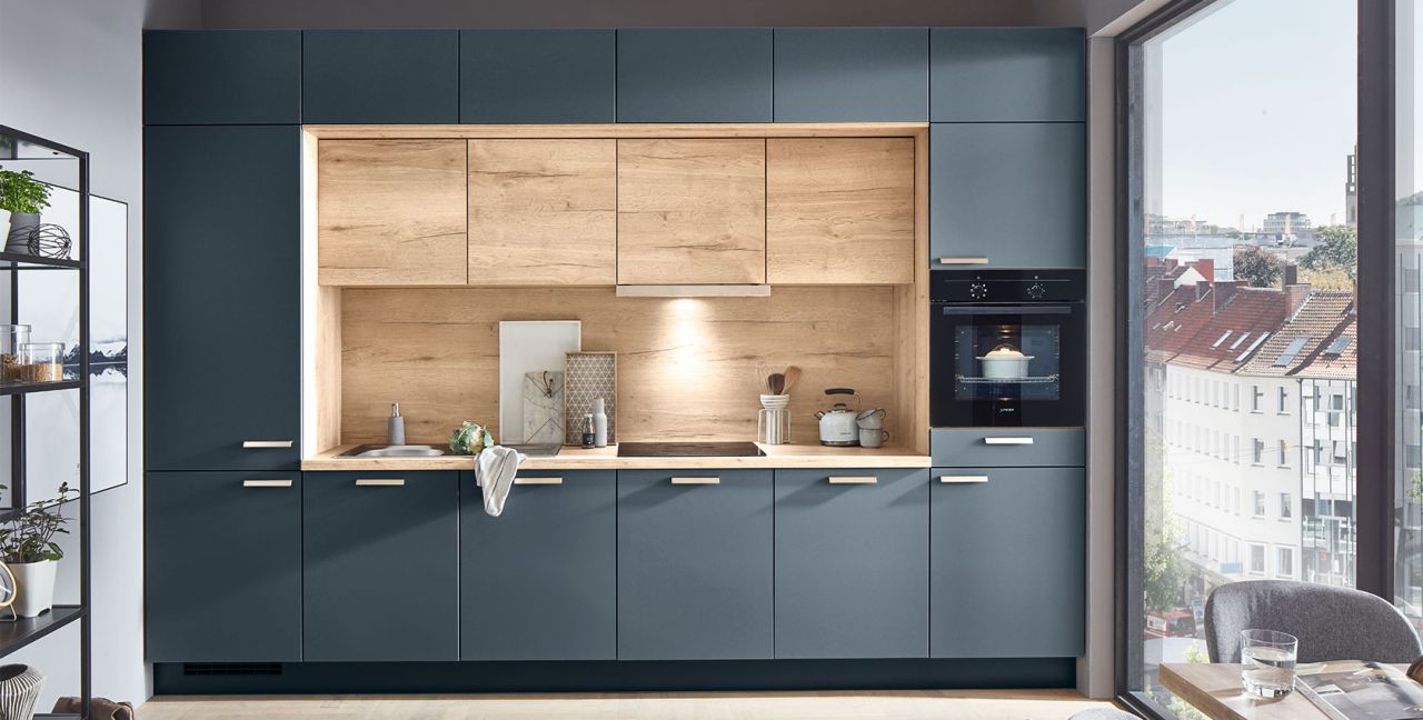 Inklusive Einbaubackofen schwarz Junker JF1300061 Energieeffizienzklasse A, Glaskeramik Kochfeld Junker JR36DT54, Flachschirmhaube Junker JD36AL51 Energieeffizienzklasse B, Kühlschrank Laurus LKG88E Energieeffizienzklasse E, Einbauspüle Edelstahl Rodi Okio Line 85 Deep, Wandschränken mit Klappe.